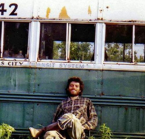 En la foto de arriba vemos a Christopher McCandless sentado frente al autobús que fue su refugio en 1992, en una de las fotografías halladas en su cámara.